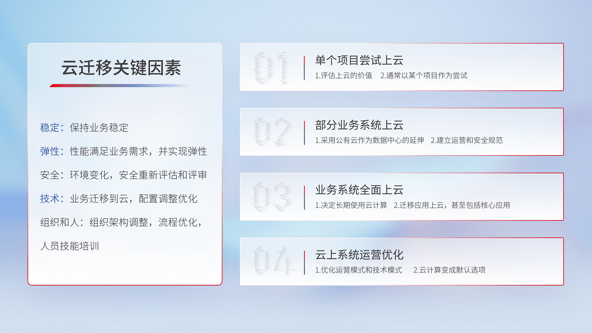结合实际业务,,,从规划设计、、、云平台选型、、、、云原生改造、、、、数据迁移、、、集成交付,,,,迁移全过程为客户识别最佳上云路径,,,做好风险识别管理,,设计网络架构、、、、身份权限、、安全审计合规、、操作审计、、、日志审计、、、、监控告警策略、、、多站点容灾设计等,,对云上基础设施进行整体规划,,,,提升IT治理水平,,以满足弹性、、、、高可用、、、高性能的需求。。