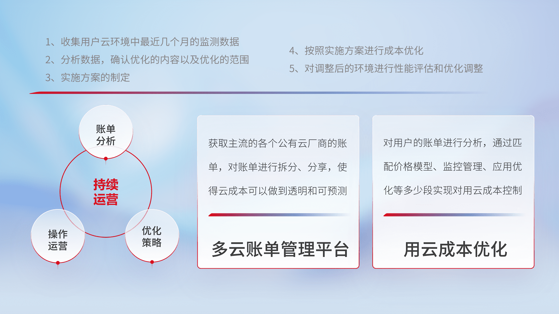 通过多云纳管,,,,以统一的资源数据模型把客户的云资源进行抽象和封装,,,进而实现对多云资源的统一操作,,,保障云资源管理的可靠性、、稳定性与可用性。。。。量身定制化运维内容,,,配置、、、开发运维、、补丁管理、、备份、、、监控、、、、认证和访问管理、、、、审计和日常巡检等,,保障在用云过程中的可靠度,,,稳定度以及高可用率。。。。